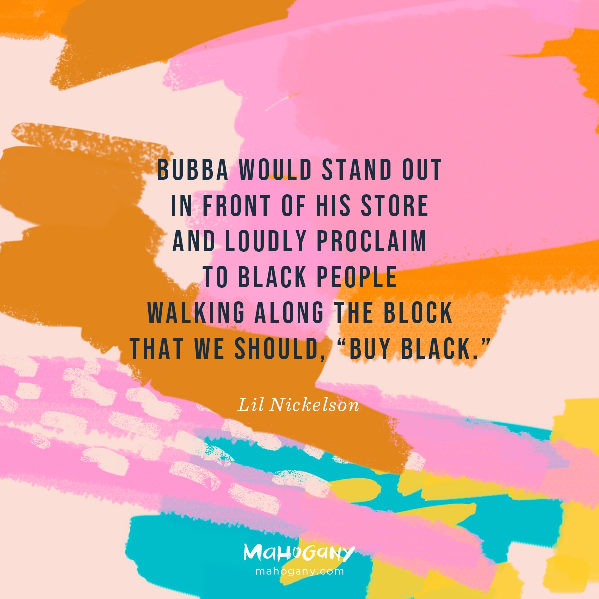 “Our money goes into their establishments and then it all leaves out of our community. They don’t sponsor any neighborhood athletic teams like I do for males, and I’m the only business that sponsors a female basketball team. Bottom line is if Black people don’t buy Black, then Black-owned businesses will cease to exist. And only a few of us will have job opportunities within our community.” And with that, Bubba stepped back into his store.”