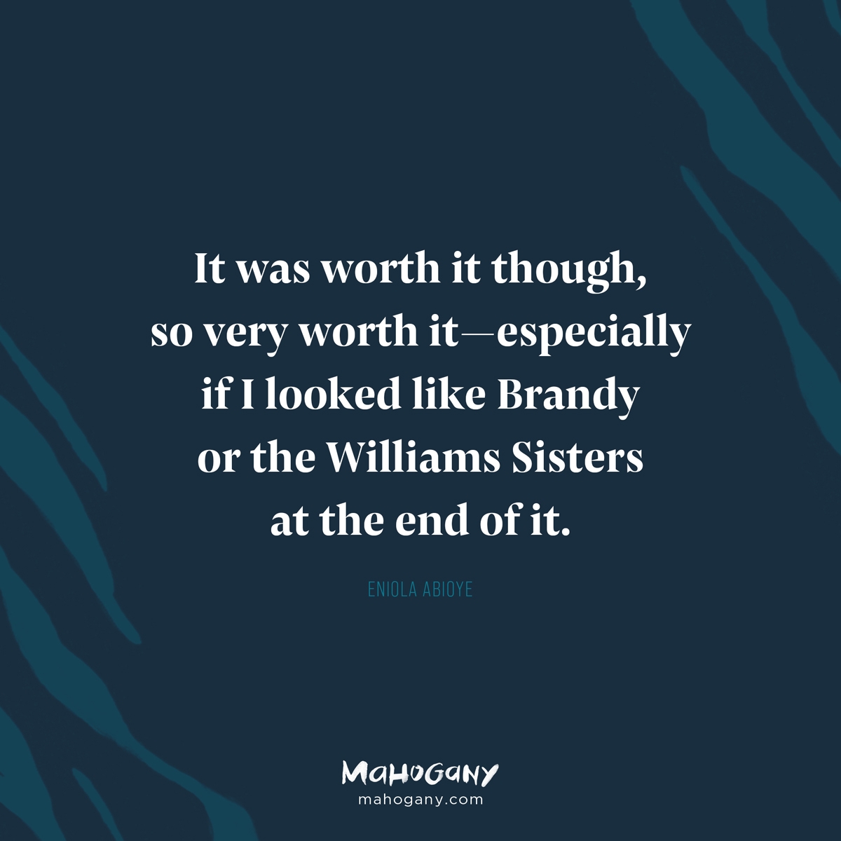 Whenever I got box braids or kinky twists, my edges would scream. I’d fall asleep with my head on my mother’s lap, a sore tailbone, and sometimes a smack on the side of the head for not keeping still in a certain direction. I would have a headache for about a day and have to sleep on my face or maneuver my head so I could avoid the painful strain on my tender scalp. It was worth it though — so very worth it — especially if I looked like Brandy or the Williams Sisters, at the end of it.