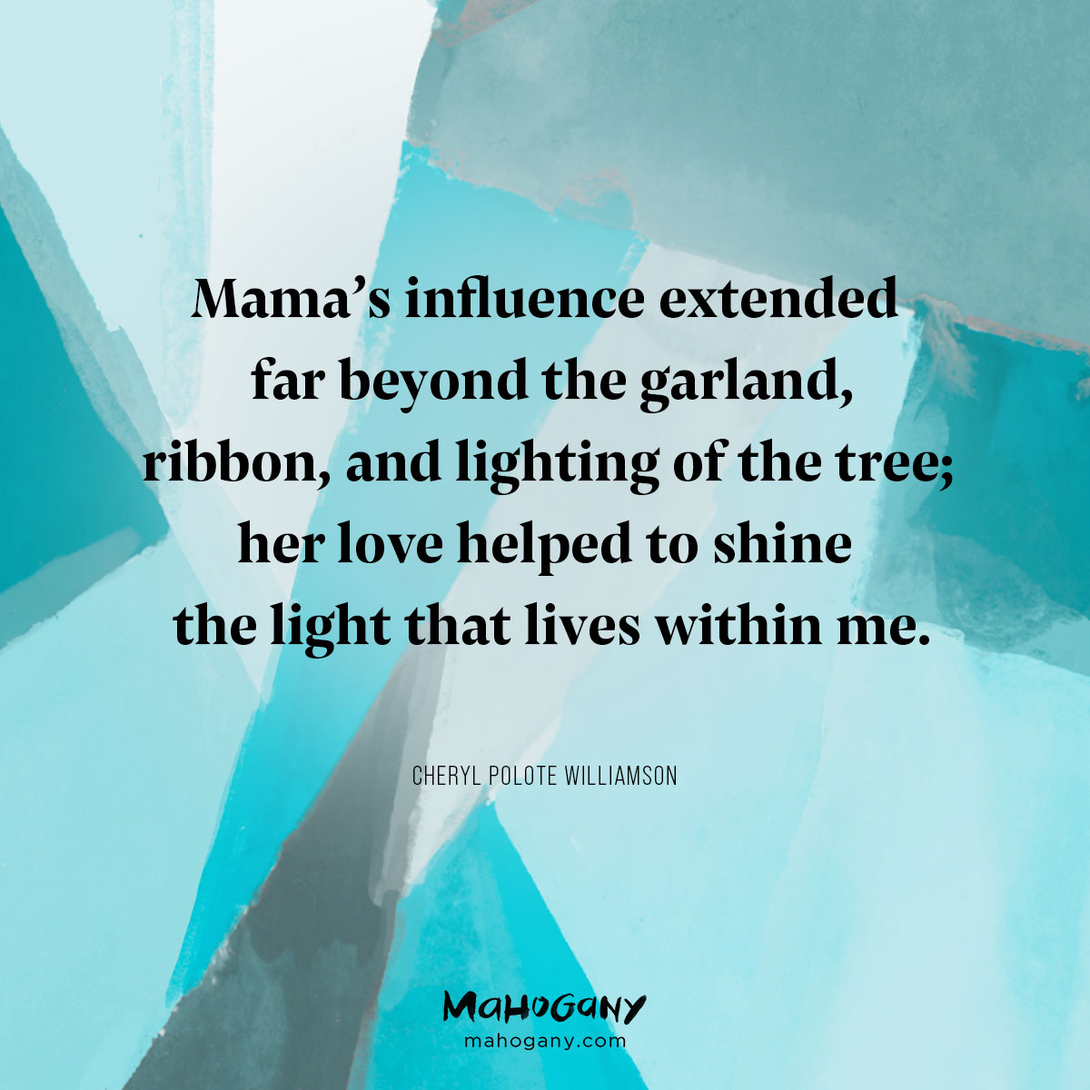10. What a beautiful tribute to your mother whose essence resonates in you. What stands out the most to me is this and I quote, “But Mama’s influence extended far beyond the garland, ribbon, and lighting of the tree; her love helped to shine the light that lives within me.”