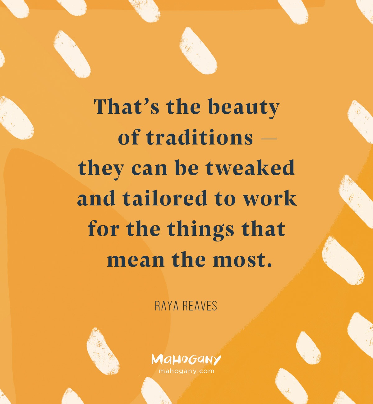 We get to think about the things that made the holidays most special and bring those things into future holiday seasons. For me, it’s baking pumpkin pies on Thanksgiving, like my mom did for us; it’s picking out and decorating a live Christmas tree every year. Then there are the new traditions I’m starting for myself, like having a special Christmas Eve dinner and taking a mini vacation in December. That’s the beauty of traditions — they can be tweaked and tailored to work for the things that mean the most.