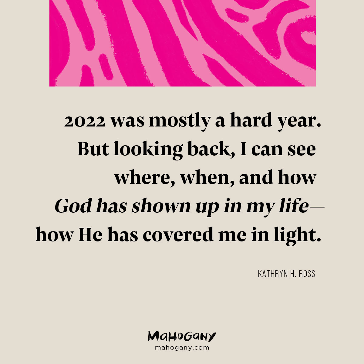 Now that we’re at the end of 2022, all I can think is: How well did I notice the moments of light in the last year? What stood out to me? What made the world feel safe and small? What made me feel like I mattered? I’m still taking stock of everything (it’s been a long year after all), but I’m delighted and humbled to find that the list I’m compiling is long and my moments of light many. The truth is, 2022 was mostly a hard year. But looking back, I can see where, when, and how God has shown up in my life—how He has covered me in light.