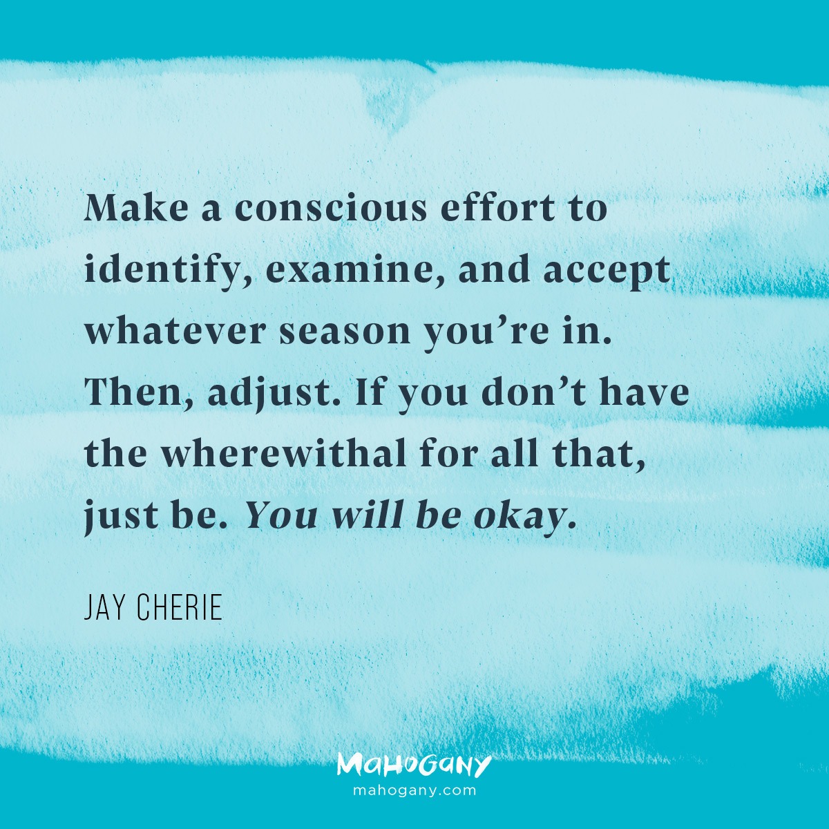- Embrace your season. We all tend to love milder seasons like spring and fall, wanting them to extend (I know I do) and want to rush through more harsh seasons like summer—heat, humidity, and bugs? I’ll pass—and winter (the wind chill in Chicago? No, thank you). But no matter what we do, they are going to be there. That’s just the way it is. Make a conscious effort to identify, examine, and accept whatever season you’re in. Then, adjust. If you don’t have the wherewithal for all that, just be. You will be okay.