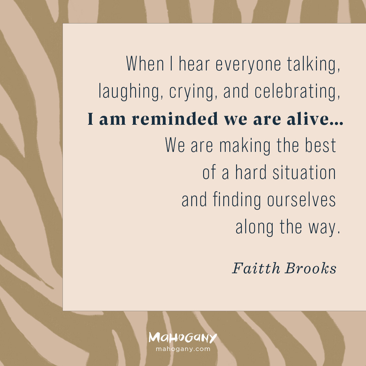 The silence I’d come to love so deeply also made me treasure the noise—the sound of community, the sound of life. When I hear everyone talking, laughing, crying, and celebrating, I am reminded we are alive. We are living freely. We are making the best of a hard situation and finding ourselves along the way.