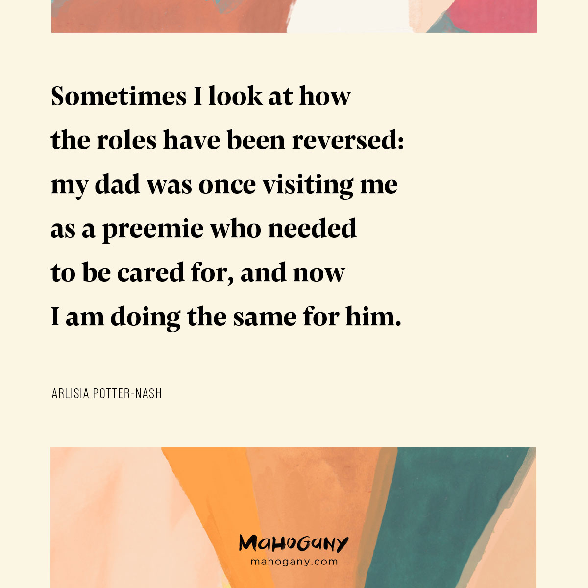 Sometimes I look at how the roles have been reversed: my dad was once visiting me as a preemie who needed to be cared for, and now I am doing the same for him. There are many things I wish were different as part of our journey: I wish that he had been there for me growing up; I wish for our old conversations where he would talk me through my morning walks; I wish he could get up and go like he used to; I wish he could have the quality of life he had previously…and the list goes on and on.