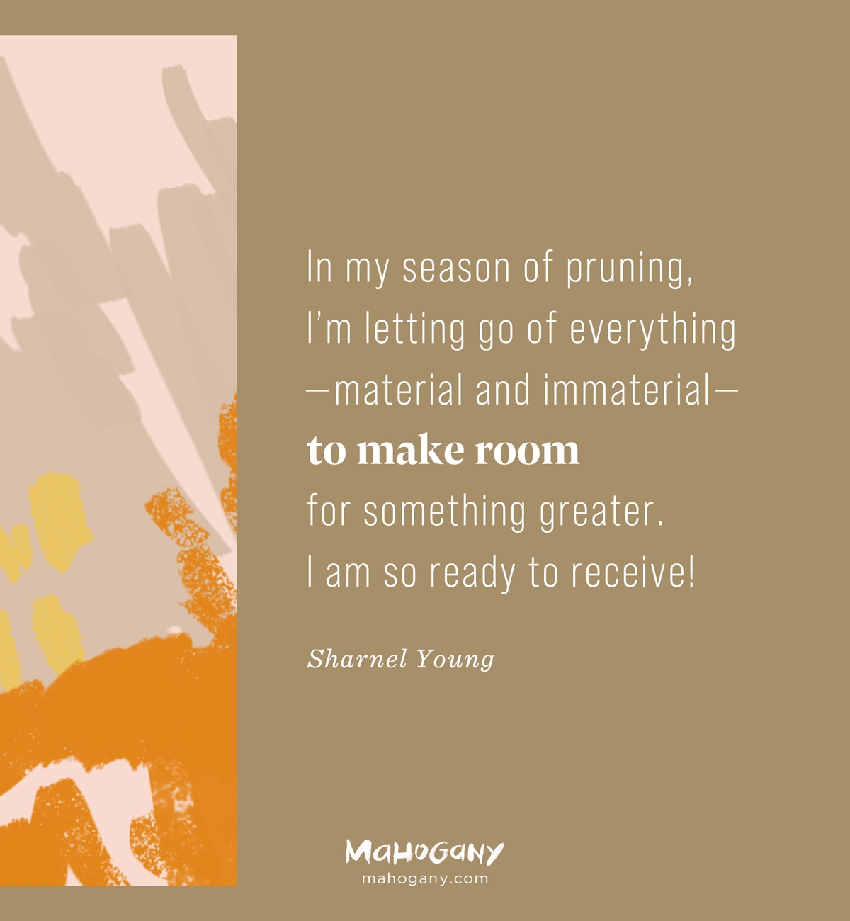 If I held on so tightly to everything, I couldn’t make room for His blessings. How can you receive anything with your hands closed? That’s how God works. In my season of pruning, I’m giving away and letting go of everything, material and immaterial, to make room for something greater. I am so ready to receive!