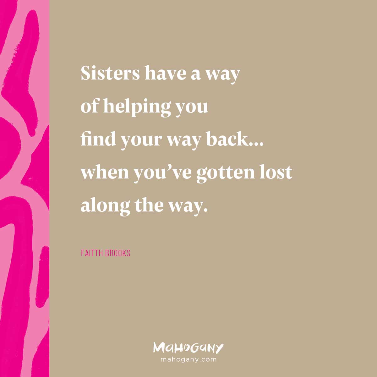 I never knew my life would be sustained by sisterhood, but sisters are essential to our personal growth. Everyone needs sisters who push you to dream beyond yourself. In tragedy, I call my sisters. When I need support, I call my sisters. When I need to talk about my mistakes, I call my sisters. Sisters have a way of helping you find your way back home—back to yourself when you’ve gotten lost along the way.